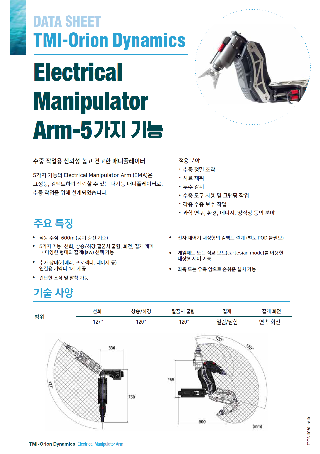 5F 전기 매니퓰레이터 암(EMA)은 수중 작동을 위해 설계된 고성능, 소형, 신뢰할 수 있는 다기능 매니퓰레이터 암입니다.