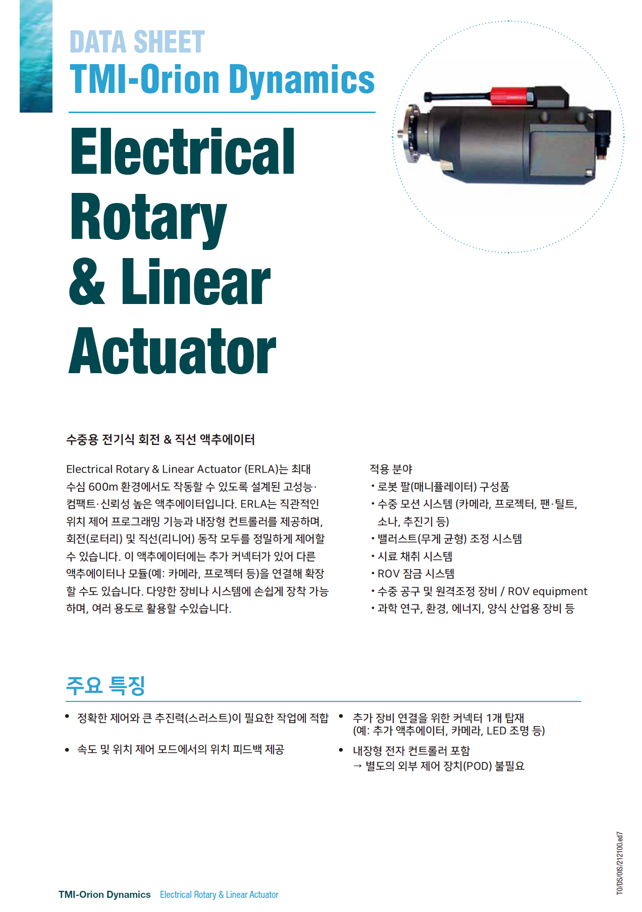 Electrical Rotary & Linear Actuator (ERLA)**는 수심 600미터까지의 수중 작전을 위해 설계된 고성능, 신뢰성 높은 소형 회전 및 직선형 액추에이터입니다.