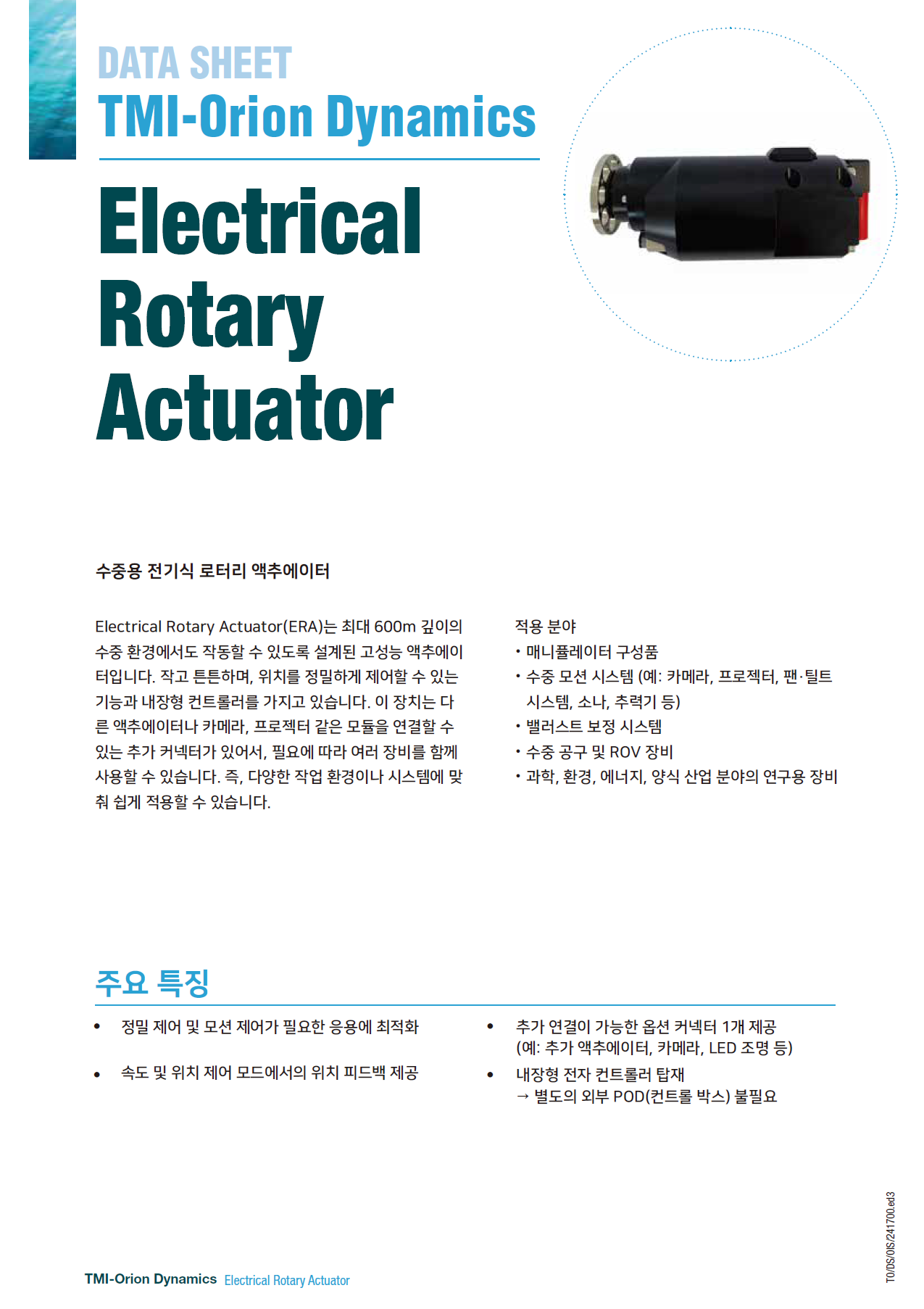 전기 로터리 액추에이터(ERA)는 600미터 깊이까지의 수중 작업을 위해 설계된 고성능, 소형, 신뢰할 수 있는 액추에이터입니다.