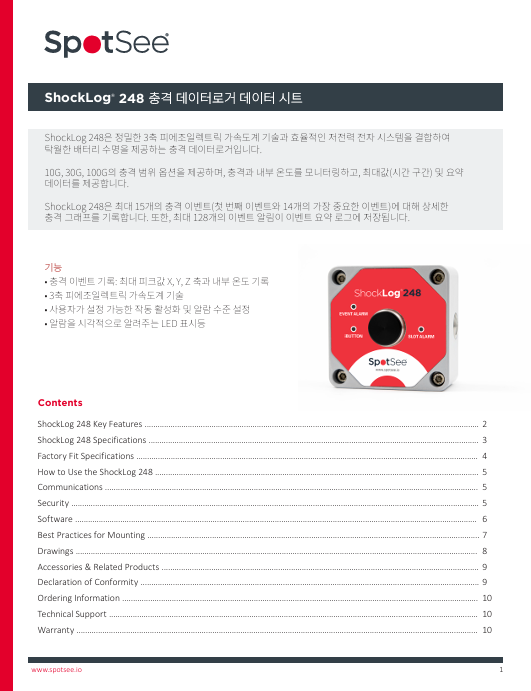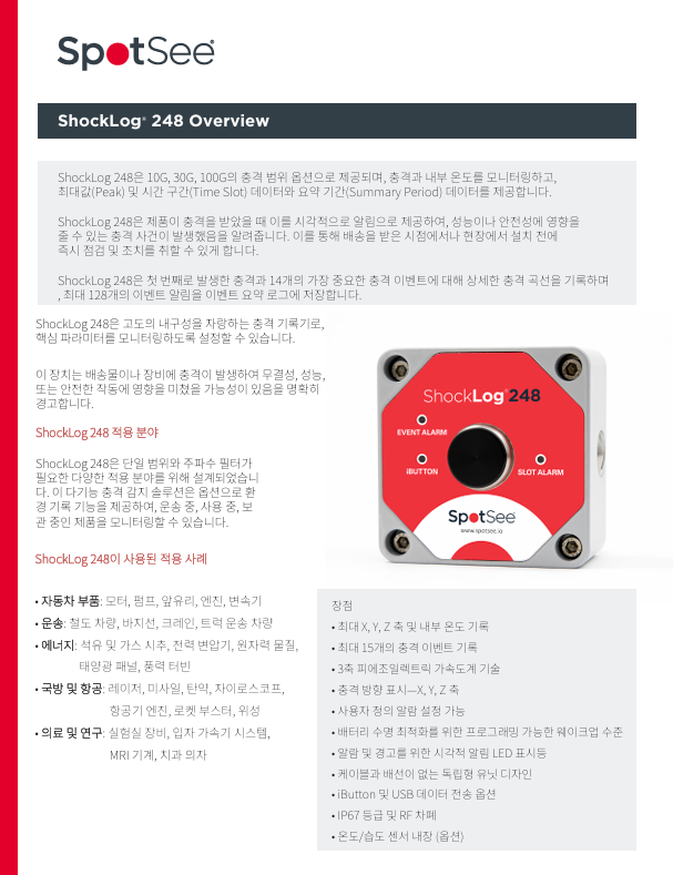 ShockLog 248은 사용 중이거나 운송 중, 또는 보관 중인 모든 구조물이나 장비에 가해지는 충격 및 환경 조건을 모니터링하고 기록합니다.