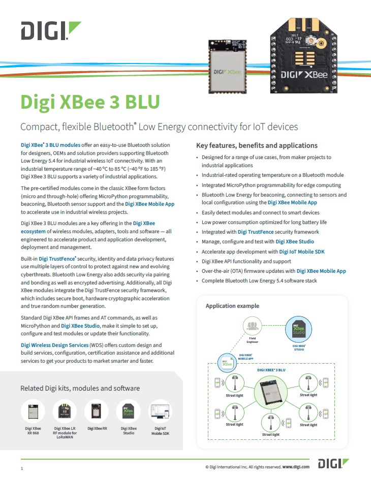Digi XBee® 3 BLU 모듈은 디자이너, OEM(주문자 상표 부착 생산자), 솔루션 제공업체를 위한 사용하기 쉬운 Bluetooth 솔루션을 제공하며, 산업용 무선 IoT 연결을 위해 Bluetooth Low Energy 5.4를 지원합니다.