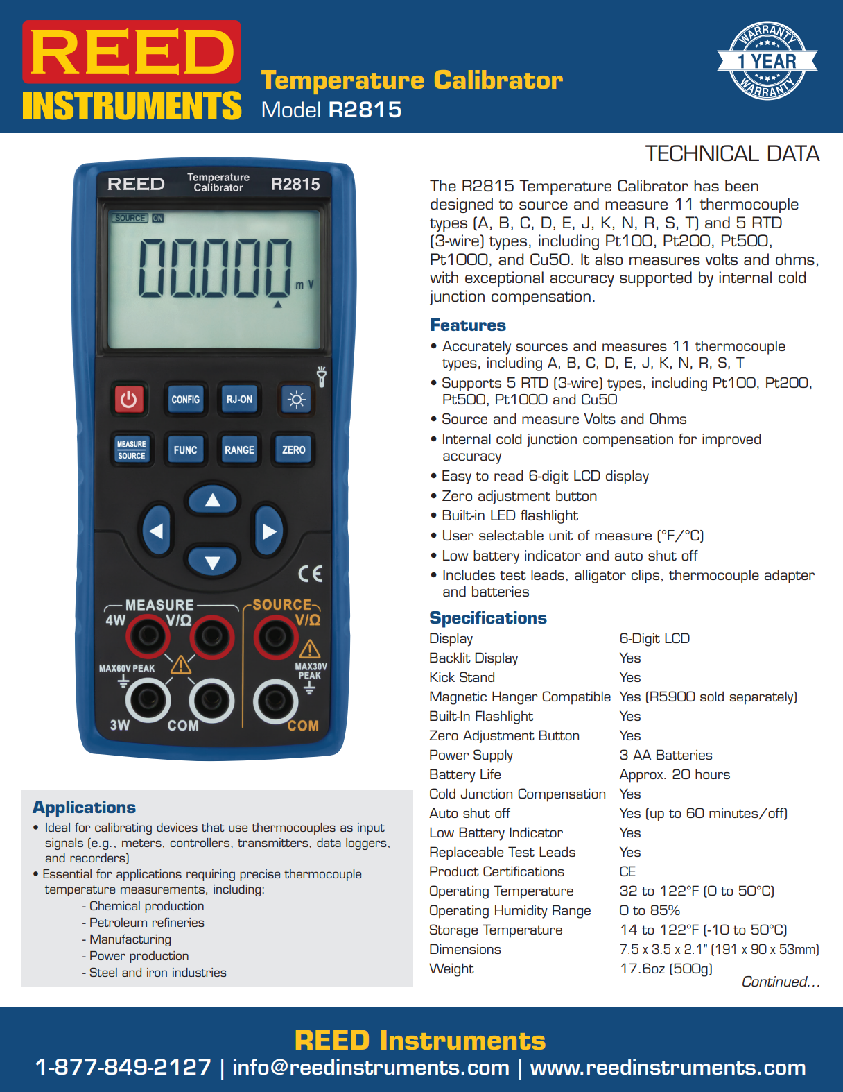 R2815 온도 교정기는 11개의 열전대 유형(A, B, C, D, E, J, K, N, R, S, T)과 Pt100, Pt200, Pt500, Pt1000, Cu50을 포함한 5개의 RTD(3와이어) 유형을 소싱하고 측정하도록 설계되었습니다. 또한 볼트와 옴을 측정하며, 내부 냉접합 보정을 통해 탁월한 정확도를 제공합니다.