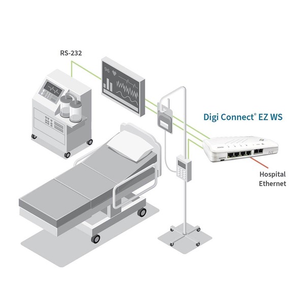 Digi Connect® EZ WS는 시리얼-이더넷(Serial-over-Ethernet) 연결을 통해 의료용 장비 데이터를 병원의 EMR(전자 의무기록) 및 기타 후속 시스템에 원활하게 통합할 수 있도록 합니다.