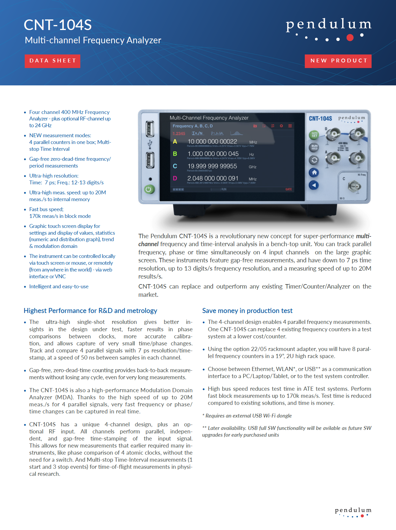 진자 CNT-104S 다중 채널 주파수 분석기는 벤치탑 유닛에서 초성능 다중 채널 주파수 및 시간 간격 분석을 위한 혁신적인 신개념입니다. 대형 그래픽 화면에서 4개의 입력 채널에서 병렬 주파수, 위상 또는 시간을 동시에 추적할 수 있습니다. 이 기기들은 간격 없는 측정 기능을 갖추고 있으며, 해상도가 7ps 미만이고, 주파수 해상도가 최대 13자리/s이며, 측정 속도는 20M 결과/s입니다. CNT-104S는 시중에 나와 있는 기존 타이머/카운터/분석기를 대체하고 성능을 능가할 수 있습니다.