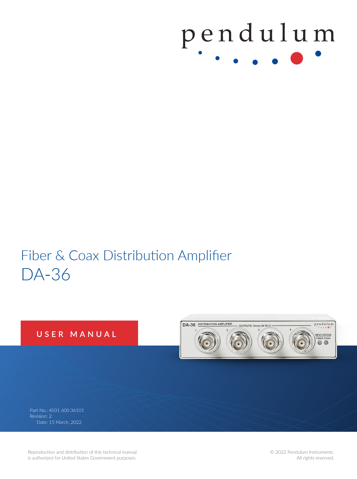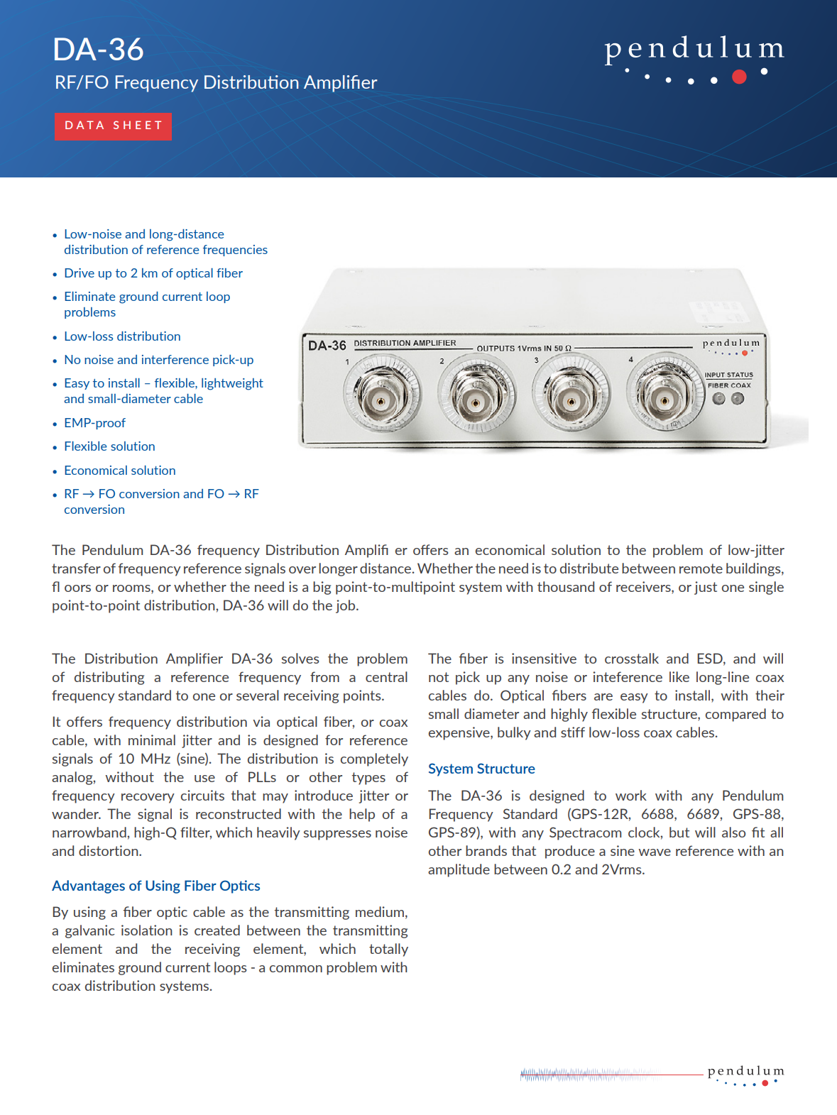 Distribution Amplifier DA-36은 중심 주파수 표준에서 하나 또는 여러 수신 지점으로 기준 주파수를 분배하는 문제를 해결합니다.